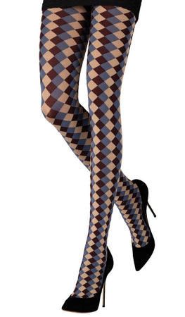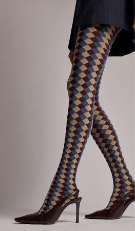 גרביון נשים אטום בדוגמת הארלקינו גיאומטרית, עם שילוב של גווני חום, כחול ושמנת