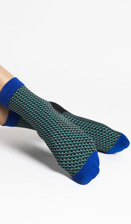גרביים בדפוס גיאומטרי בגוון ירוק עם גימורים בורוד כחול.